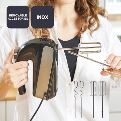Il frullatore manuale consente di mescolare impasti leggeri e densi con 450 W di potenza ad alte...5 velocità regolabili e un pulsante turbo che si adattano a tutte le tue esigenze di pasticceria...2 aste in acciaio inox di alta qualità che servono per frullare perfettamente impasti e impasti...