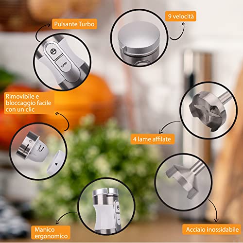 Dobbiamo tenere conto anche delle funzioni che lo strumento mette a disposizione dell’utilizzatore. In questo caso, data la presenza di diversi accessori che esamineremo nel prossimo paragrafo, avrete a disposizione un utilizzo più vario. Infatti questo questo strumento si può usare sia come classico sbattitore elettrico che come frullatore ad immersione. A vostra disposizione ci sarà poi anche la funzione Turbo.