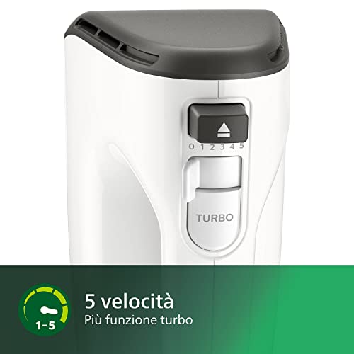 Lo sbattitore elettrico Philips Mixer HR3740/00 Daily Collection è un modello molto classico, e questo vale sia per il suo design che per le funzioni previste. Infatti si tratta di un tradizionale sbattitore elettrico di tipo manuale, caratterizzato dalla presenza di una doppia frusta che si aziona simultaneamente e che può essere utilizzata per impastare, frullare, mescolare e per montare. Inoltre all'interno della confezione troverete anche un'altra coppia di fruste, questa volta a spirale, che sono particolarmente indicate per la realizzazione di impasti lievitati. La potenza di base di questo modello è ottima, infatti ci sono 450 watt; questo valore, essendo più alto della media, permette al motore di essere molto potente e di avere una velocità ottima, ovviamente anch'essa regolabile su diversi livelli fino ad un massimo di 5. Dobbiamo dire però che forse per delle dosi particolarmente abbondanti di impasto lo sbattitore fa un po' di fatica a miscelarle correttamente. Inoltre anche il cavo di alimentazione non è lunghissimo, ma questa è una caratteristica che accomuna moltissimi modelli in commercio. Il prezzo di vendita è invece ottimo, e rende questo sbattitore elettrico del marchio conveniente e allo stesso tempo sempre versatile, efficiente e particolarmente comodo da utilizzare in cucina.